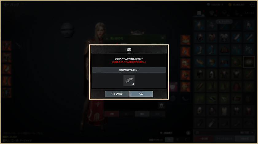 分解確認メッセージと分解結果で得られるアイテムが表示され、OKを選択すると分解が完了します。
