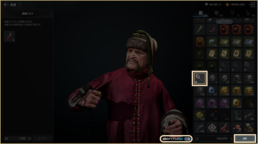 ・倉庫で保管できるアイテムは最大50個です。