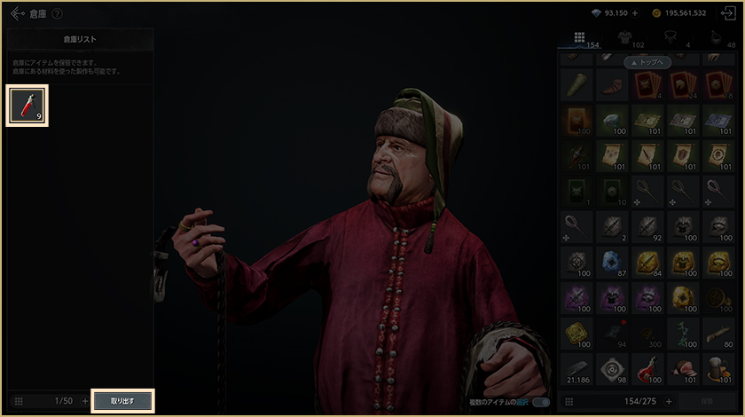 倉庫に保管されたアイテムを選択し「取り出す」を選択すると、そのアイテムはバッグに移動します。