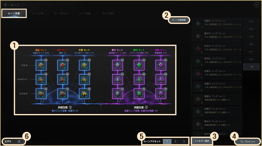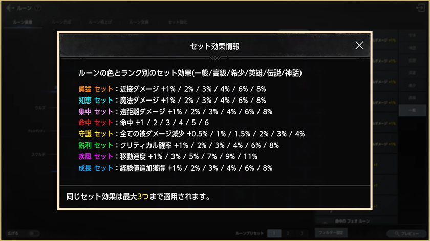 2.セット効果情報:各ルーンの種類とランク別のセット効果を確認できます。