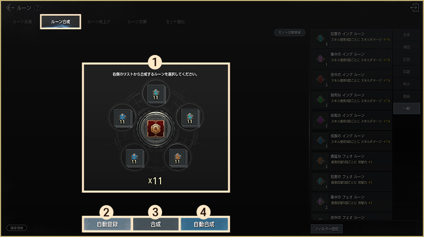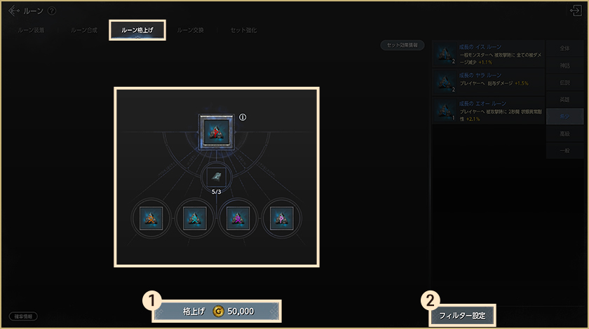 ルーンの格上げには、格上げするルーン1個と同じ階級・同じ種類のルーン4個が必要です。