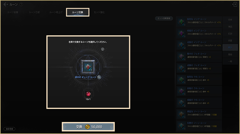ルーンの交換には、交換対象となるルーン1個に、魔力が宿るルーン交換石とゴールドが必要です。