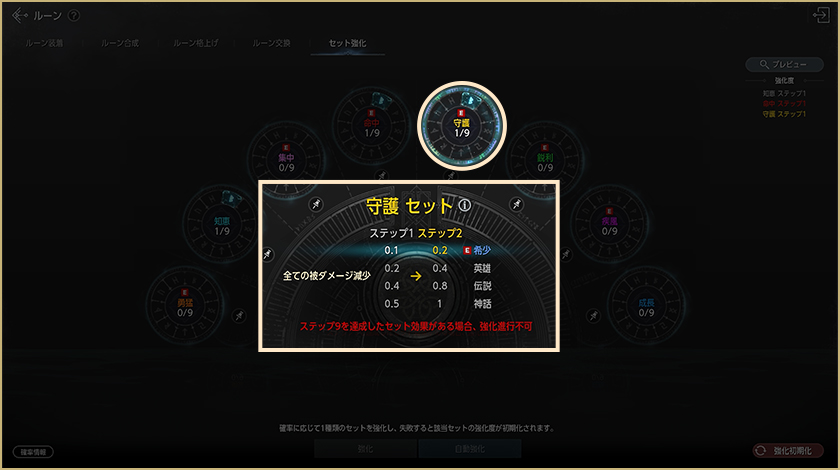 – ルーンセット強化9段階未到達時:500,000ゴールド消費 / ルーンセット強化9段階達成時:無料