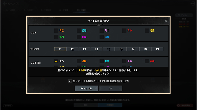 – セット自動強化設定で選択したすべてのセット効果が、設定した強化段階を達成するまで自動的に強化を進行します。