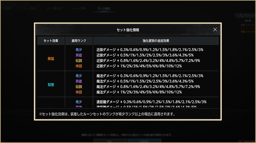 セット強化は希少~神話ランクまで可能で、強化段階上昇時、追加効果が適用されます。
