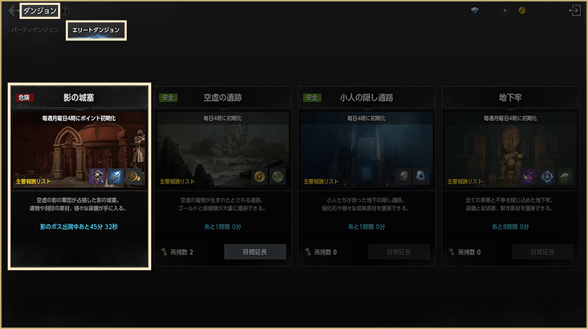 「影の城塞」含む「エリートダンジョン」、「パーティダンジョン」について以下、画像を選択すると、それぞれのコンテンツガイドが確認できます。
