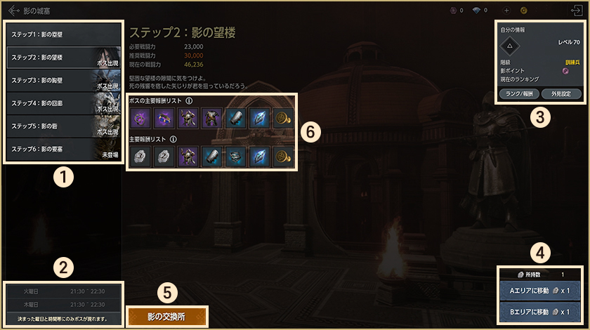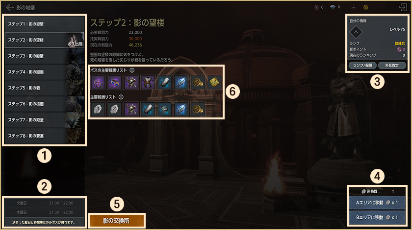 1.ステップ 影の城塞は8ステップで構成され、それぞれ難易度や獲得できる報酬が異なります。