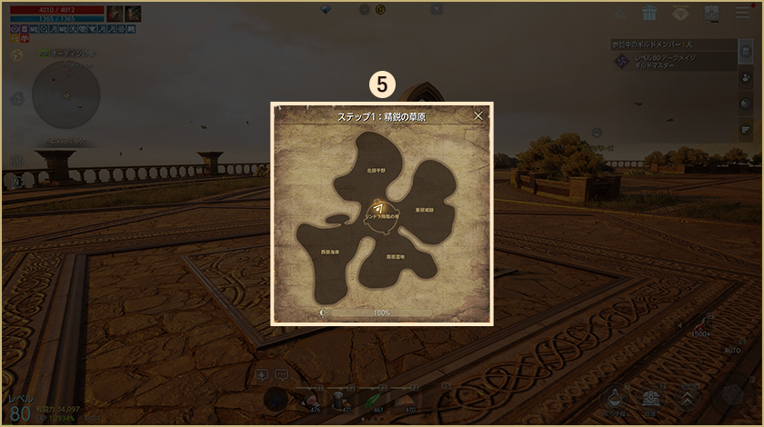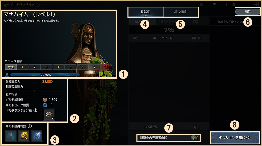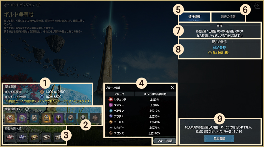 4.進行情報:ギルド順位及びコンテンツ進行情報を確認することができます。