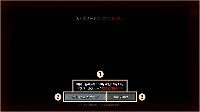 -ダンジョン内で戦闘不能状態になった場合のみ拠点で復活します。