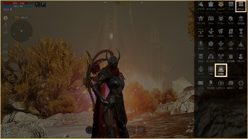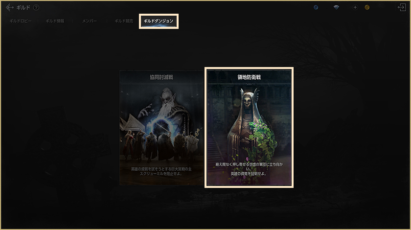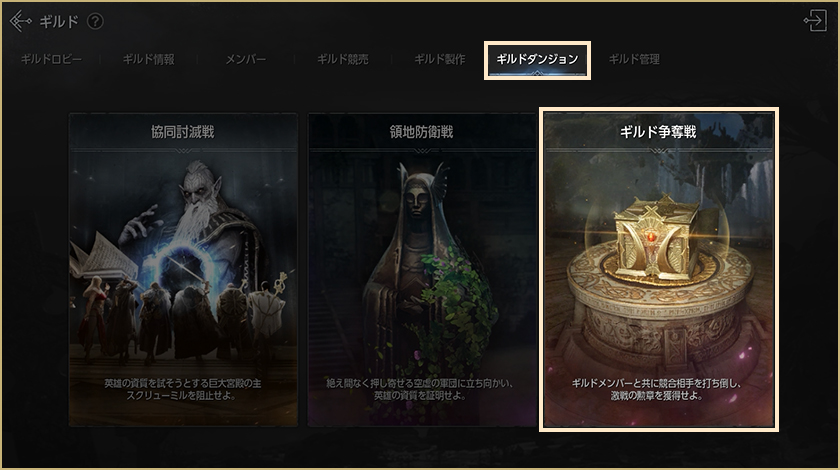 – 右上のメニュー[ギルド]>[ギルドダンジョン]タブ>[ギルド争奪戦]から入場できます。