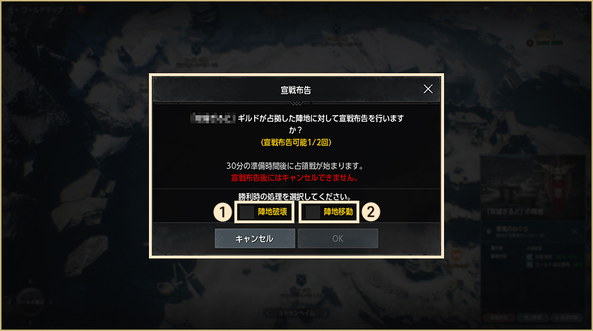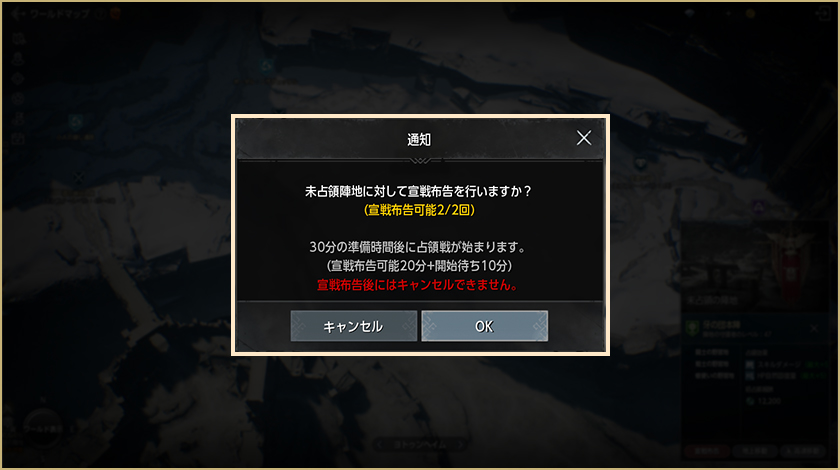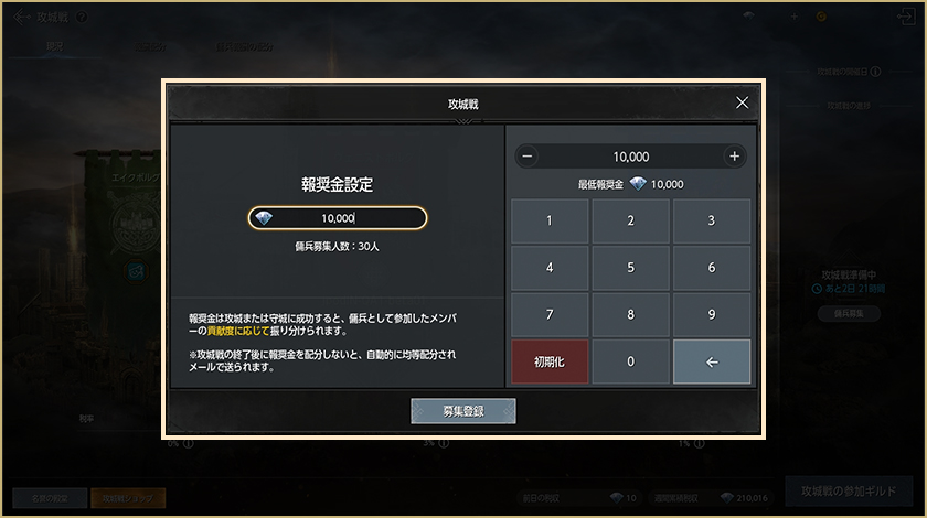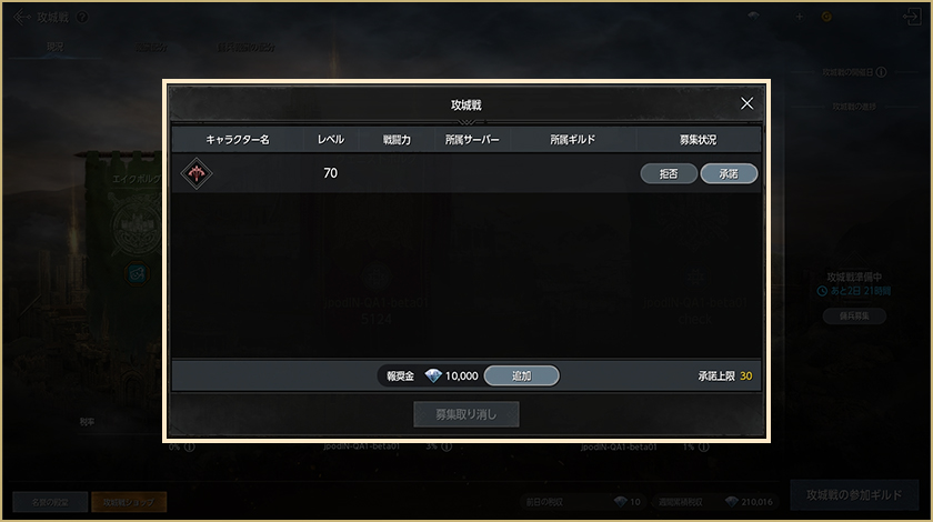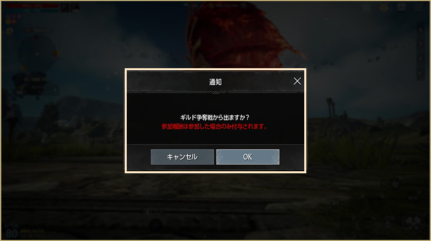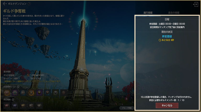 – 参加登録期間中、ギルド争奪戦の参加に必要な最低人数10人が参加登録をしなければマッチングは行われません。