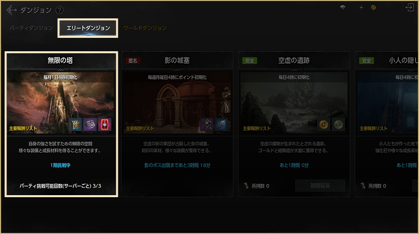 エリートダンジョンは経験値やゴールドなどの報酬が獲得しやすいダンジョンで、報酬別に複数のダンジョンがあります。プレイできる時間の制限があるので、忘れずに挑戦しましょう!