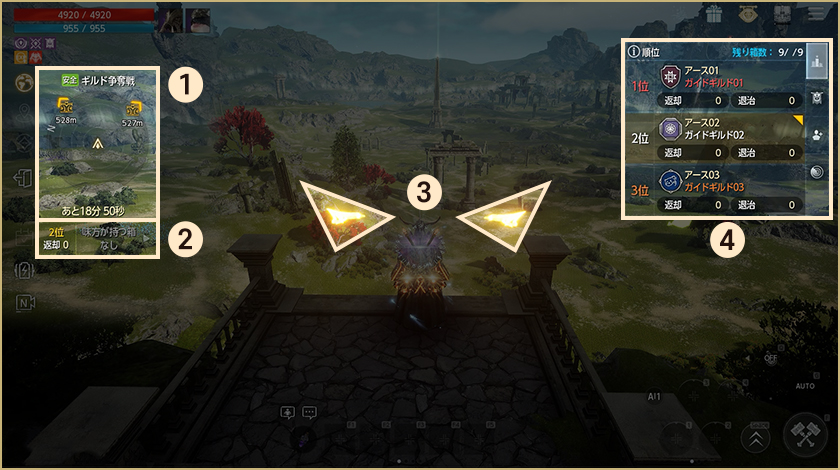 – ギルド毎に異なるスタート位置に入場し、5分間の待機時間があります。