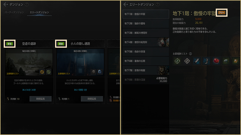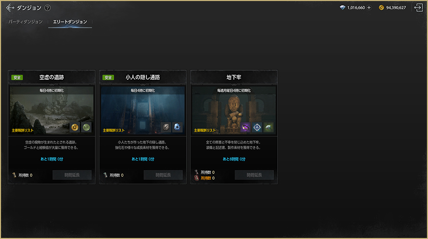 ※一部のエリートダンジョンは1日ごと、または週ごとに参加可能時間があります。