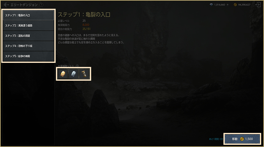 各エリートダンジョンには数段階のステップが存在し、参加したいステップを選択して「移動」を選択してください。