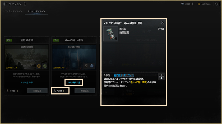 エリートダンジョンの参加可能時間は「ノルンの砂時計」など、特定のアイテムでチャージできます。